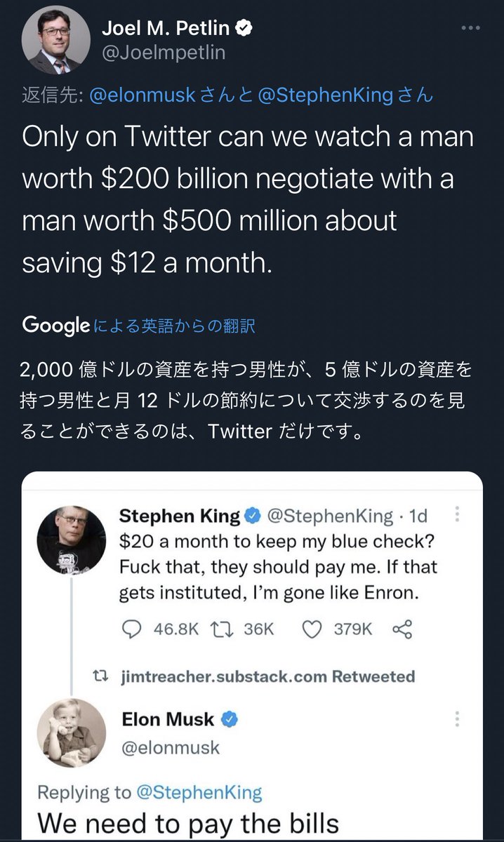 イーロン・マスク氏は、サブスクリプション(定額制)サービス「ツイッター・ブルー」の利用額を月額8ドル(約1180円)にすると正式に発表した。この月額8ドルは購買力平価に比例して国ごとに調整されるという。またアカウントが本物であることを示す青色の「認証済みバッジ」をブルーに含むとしている。その上でTwitterの広告への依存度低下を図る考え(ロイター、Bloomberg)。